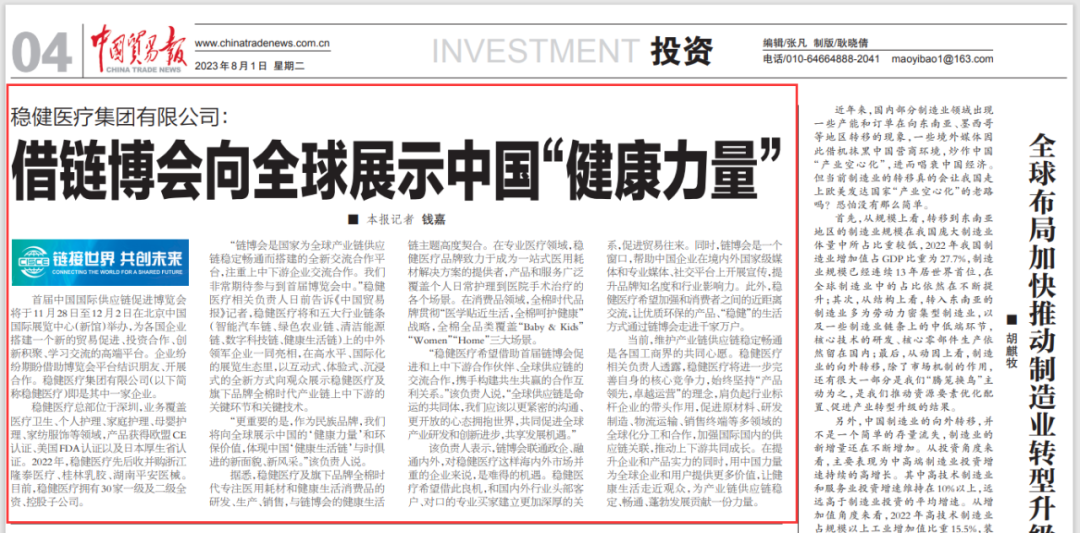 当前,维护产业链供应链稳定畅通是各国工商界的共同心愿。稳健医疗相关负责人透露,稳健医疗将进一步完善自身的核心竞争力,始终坚持“产品领先,卓越运营”的理念,肩负起行业标杆企业的带头作用,促进原材料、研发制造、物流运输、销售终端等多领域的全球化分工和合作,加强国际国内的供应链关联,推动上下游共同成长。在提升企业和产品实力的同时,用中国力量为全球企业和用户提供更多价值,让健康生活走近观众,为产业链供应链稳定、畅通、蓬勃发展贡献一份力量。