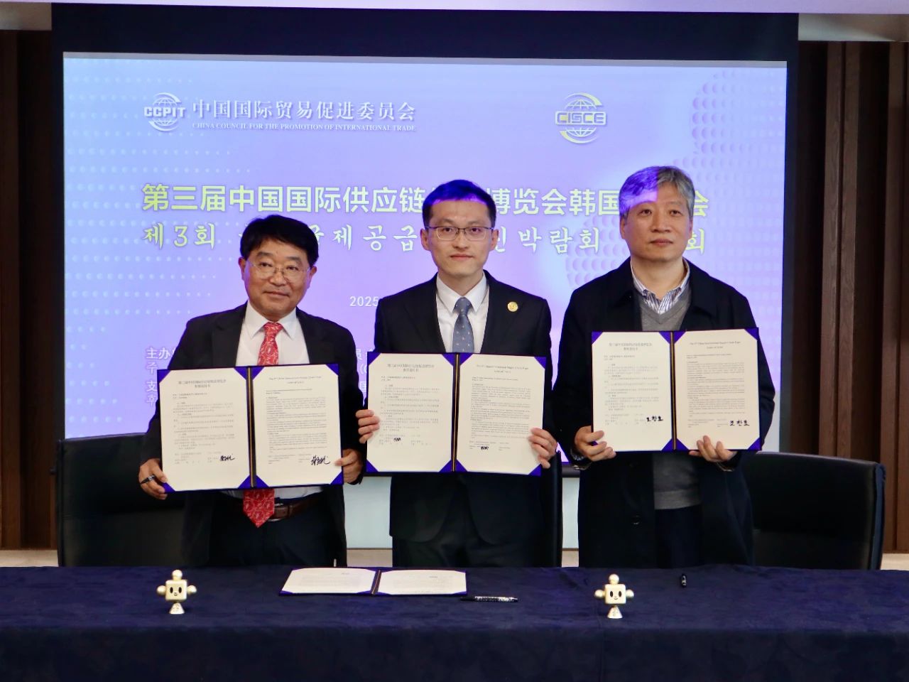 本次活动由中国贸促会主办,中韩两国贸易投资促进机构、商协会和企业代表等100余人参会。活动期间,中展集团推介第三届链博会,中国贸促会驻韩国代表处与中韩有关机构签署合作备忘录。